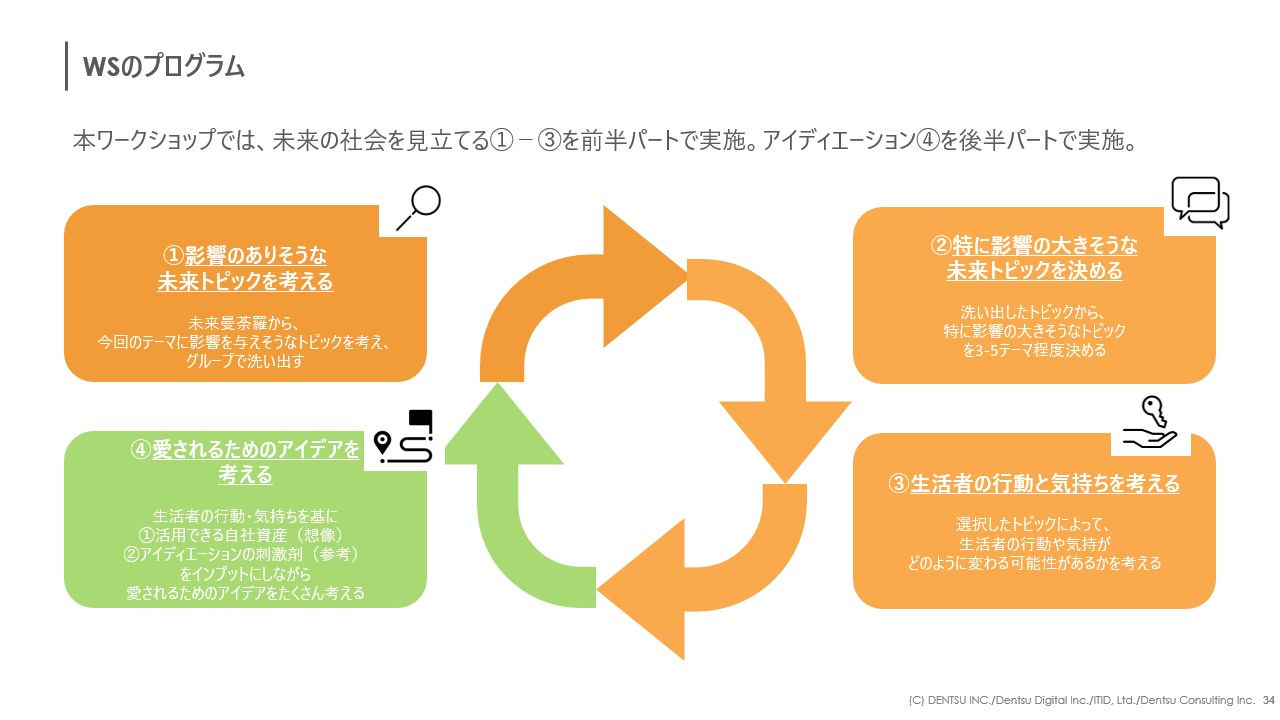 前半は約40分です。ディスカッションテーマ(後述)を基に、「未来曼荼羅2023」を参照しながら①②③のステップ(下図参照)で未来の社会への影響が大きそうなトピックを推測し、生活者の行動と気持ちがどう変わっていくかを考えていただきます。
