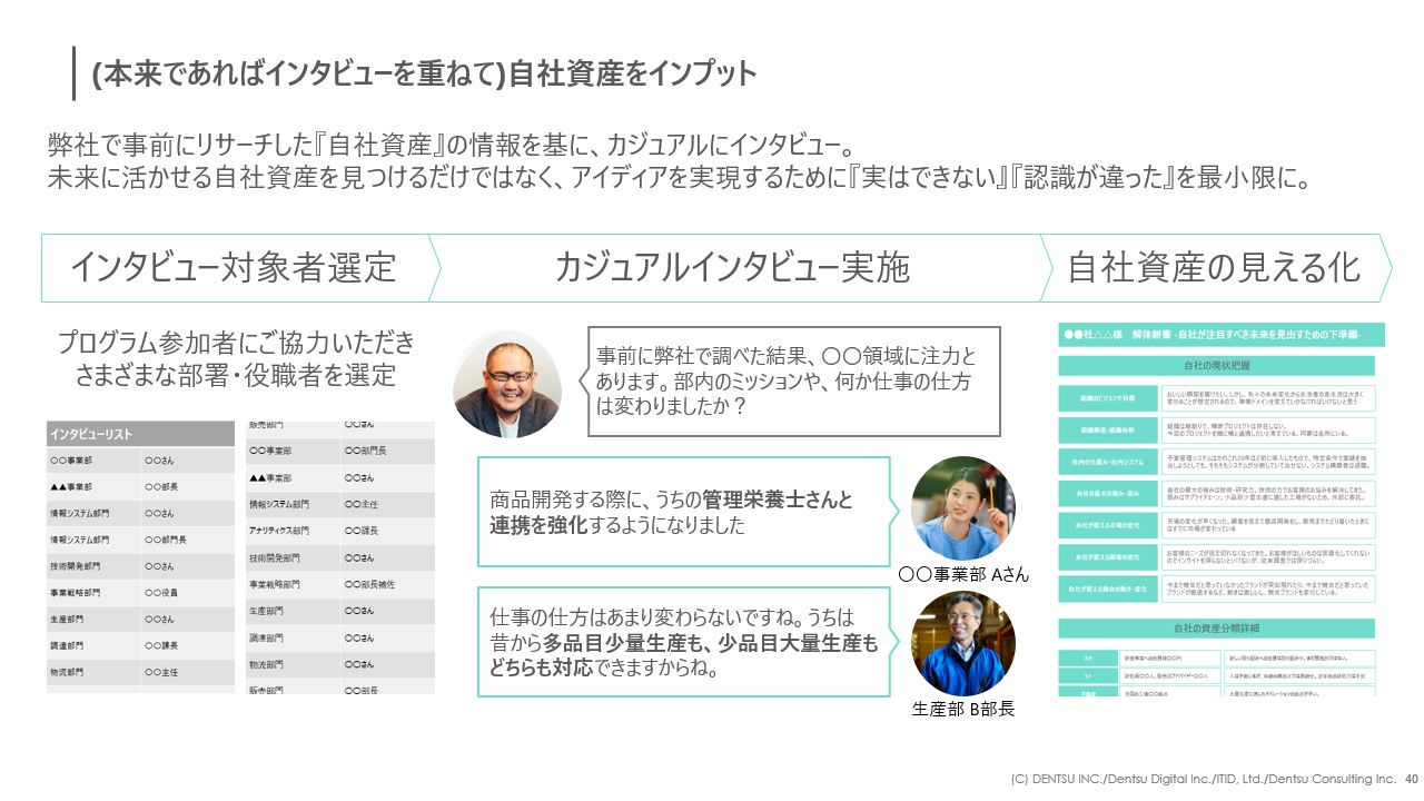 メンバー全員がきちんと「未来視点」になったところで、様々な部署の方たちにインタビューを実施して、現在の会社の資産や強みを見える化していきます。この手順を踏むことで、自社資産がただ調べるよりも何倍もの輝きを持って見える化されるはずです。