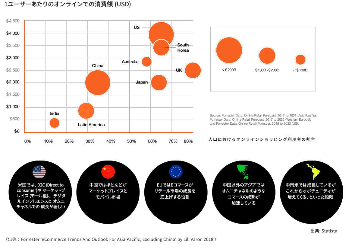 「日本の市場は非常に成熟しており、アジアパシフィックにおいて中国に次ぐ大きな市場規模を誇っている。2018年のEC売上は、956億ドルにもなっているほどだ。この背景には、インターネットの普及率の高さ、EC利用者数の多さ、ひとりあたりのECでの購入金額の高さが挙げられる」とした。