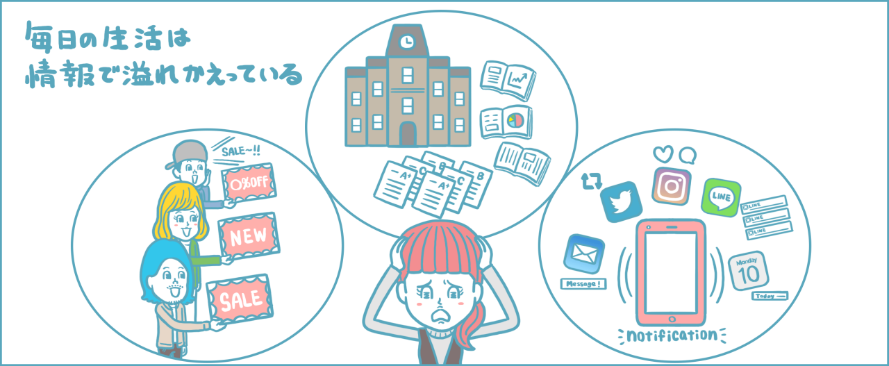 例えばスマートフォンからの情報を考えると、ニュースをはじめ、TwitterやInstagramなどのSNS、友人からLINEで送られてくるYoutubeの動画、ゼミの先輩からシェアされた就活関連サイト、一度利用しただけの通販サイトのメールマガジン、...。