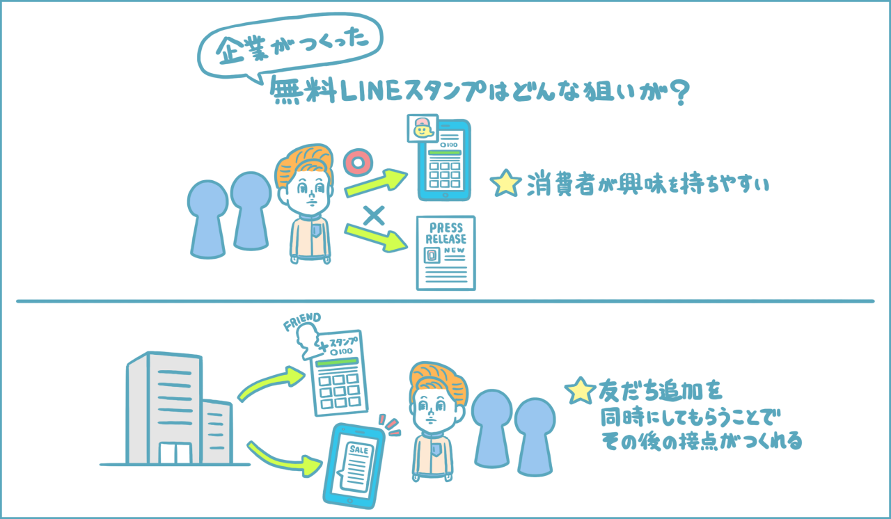 企業はスタンプのダウンロードをする前にアカウントの友だち登録をしてもらうことを狙いにしており、その先にはLINEを使って情報発信やコミュニケーションをすることを見据えています。
