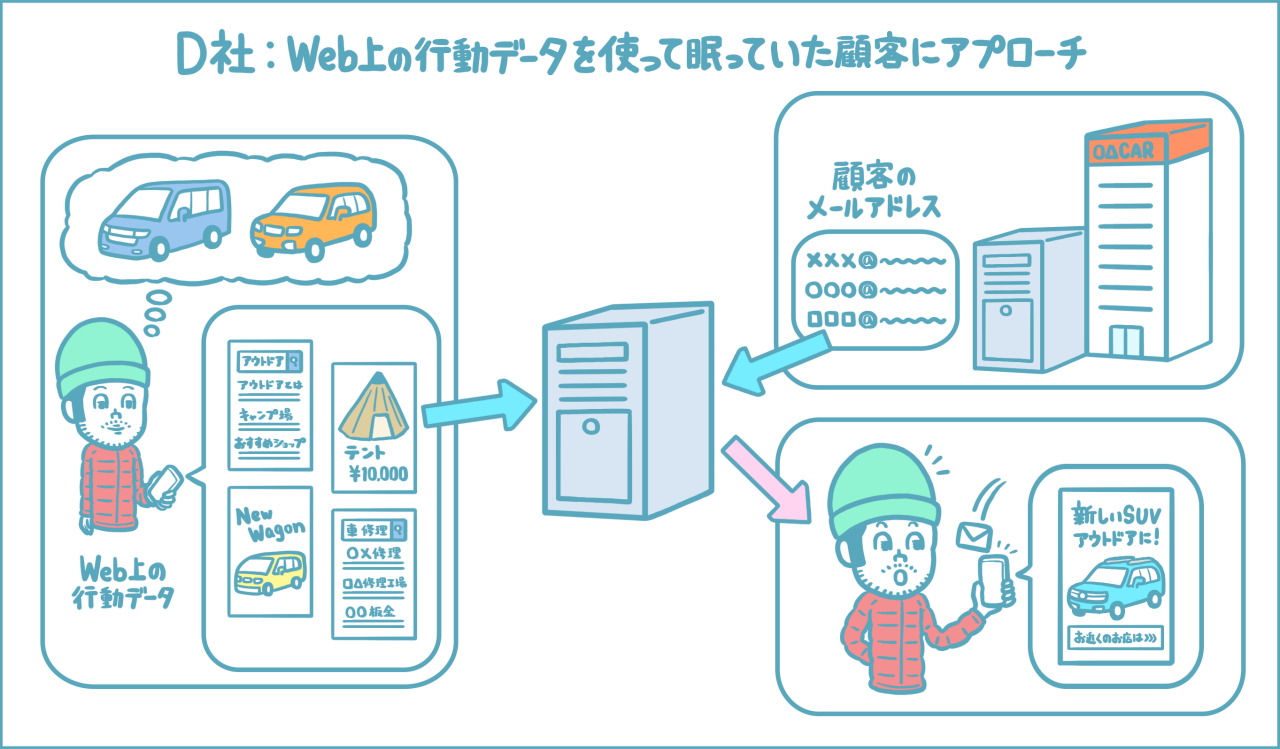 自動車も生命保険と同じく、ライフイベントに連動して購入・買い替えが起きやすい商品です。D社はデータを使って、どのようなアプローチをしたのでしょうか。