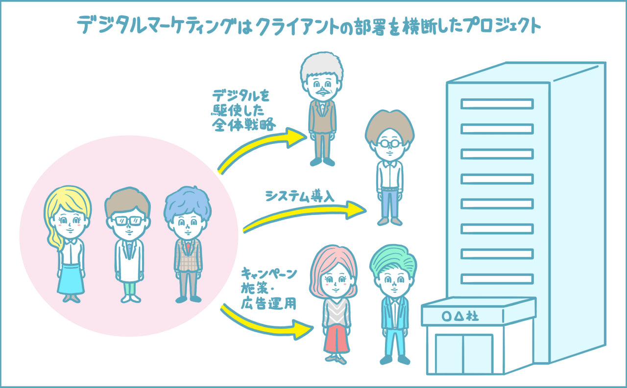 また、今回登場したC社・D社といった企業のデジタルマーケティングのコンサルティングをすることは、マーケティング部だけでなく、営業部やシステム開発部など、クライアント企業の複数の部署をまたいだ一大プロジェクトをリードする仕事です。ときには経営者も加わり、クライアント企業の社運をかけた施策を進めていくこともあるのは、大変な部分でもあり醍醐味ともいえるでしょう。