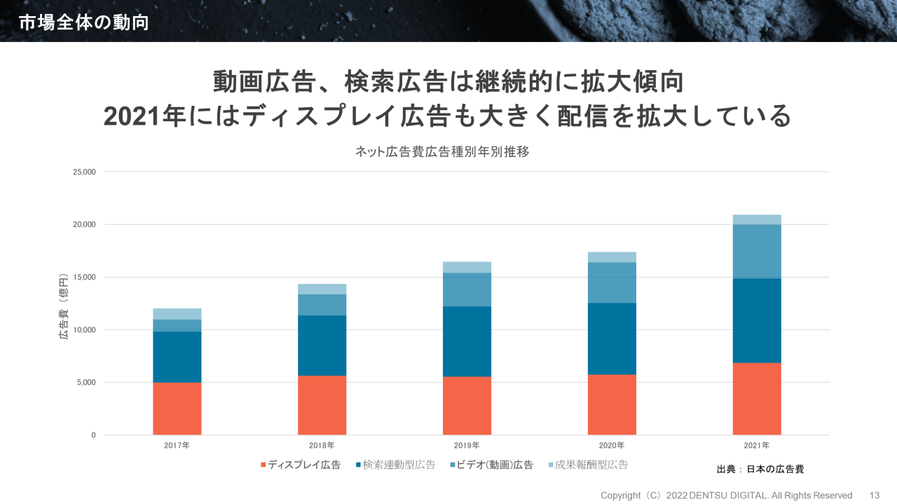 電通デジタル 吉良達彦(以下、吉良) : インターネット広告には、おもに「ディスプレイ広告」「検索広告」「ビデオ(動画)広告」「成果報酬型広告」の4つの種類があります。ディスプレイ広告は、2021年には前年から大きく拡大しており、ネット広告費全体の約3割を占めています。