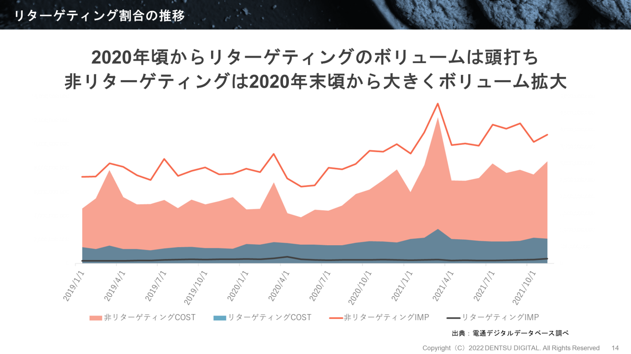 しかし、ディスプレイ広告の内訳を見ると、リターゲティングのボリュームには頭打ち感が見られます。