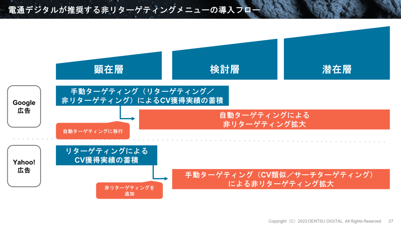 リターゲティングだけに頼っていると、ユーザー獲得やCV獲得はどんどん減少していきます。非リターゲティングを拡大するには、Google 広告とYahoo!広告、どちらの場合も、顕在層のCVデータをできるだけ多く蓄積したうえで、なるべく早く移行を進めることが重要です。