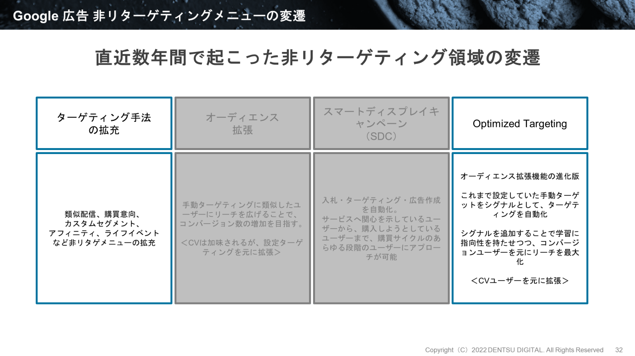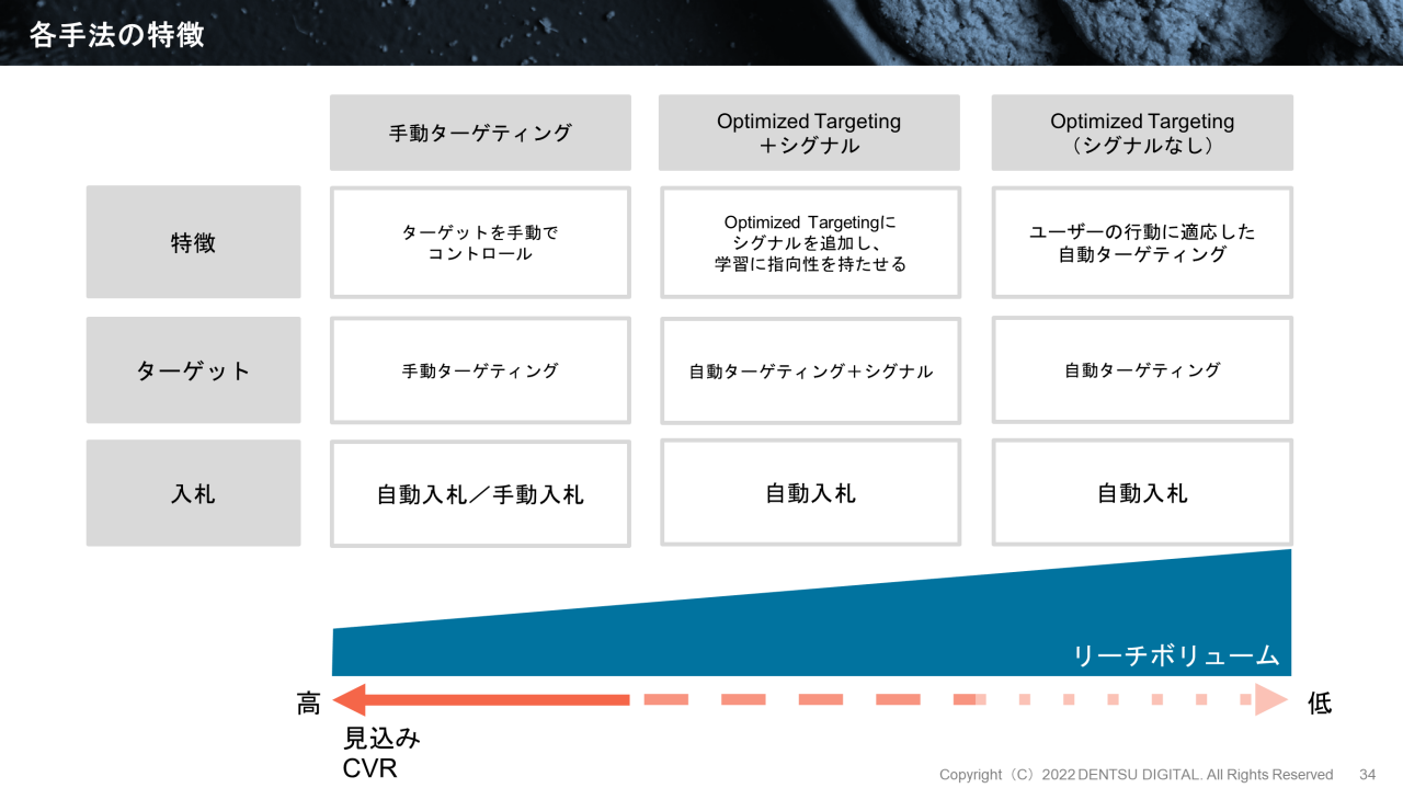一方、Optimized Targetingの場合は、効率よく獲得ができている既存のターゲティングをもとに、それをシグナルとして進化させる流れを作ることがポイントです。そこで電通デジタルでは、「Optimized Targeting(自動ターゲティング)+シグナル」(上図の中央)の利用を推奨しています。