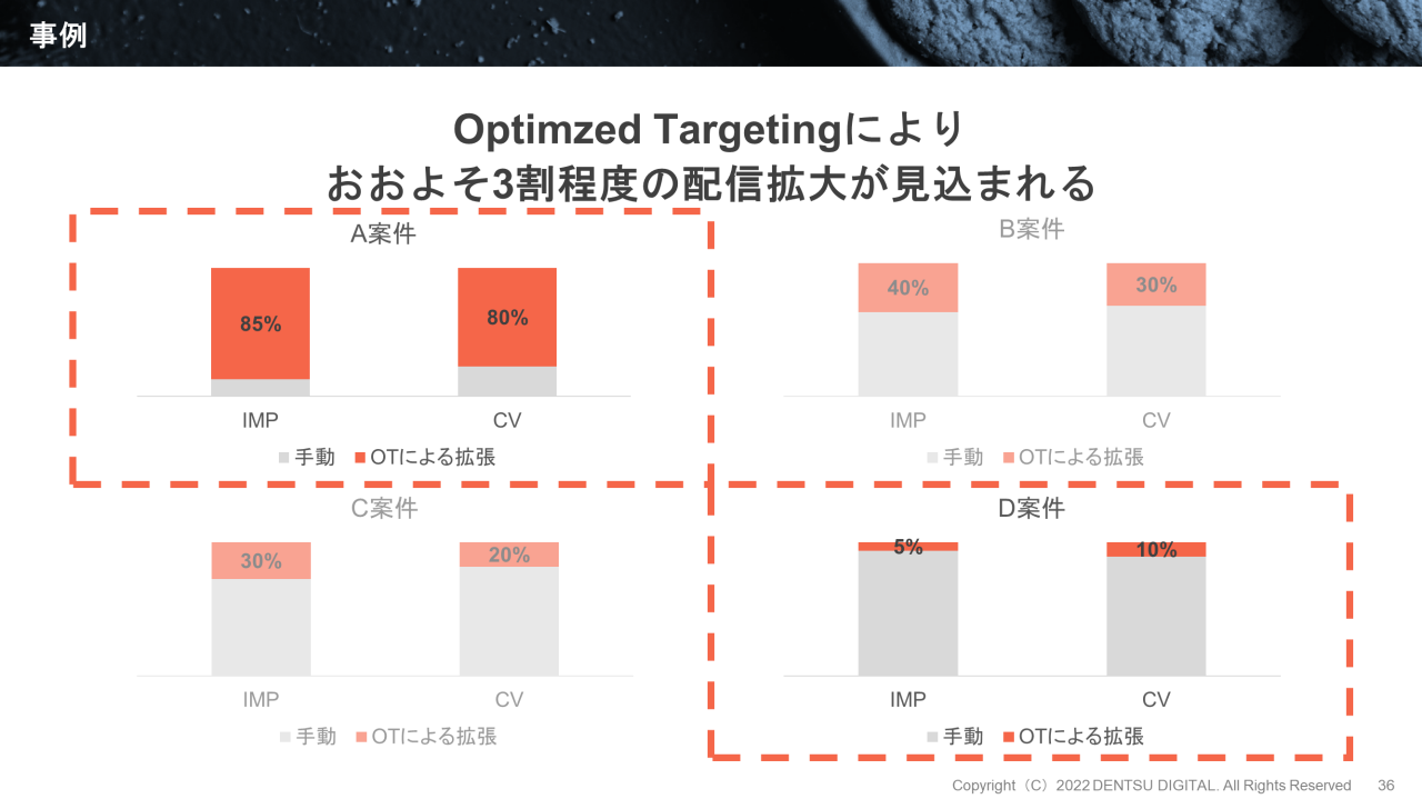 では、Optimized Targetingの4つの事例を比較しながら、活用ポイントを解説します。以下のA〜D案件の結果[5]を示す積み上げ棒グラフを見てください。