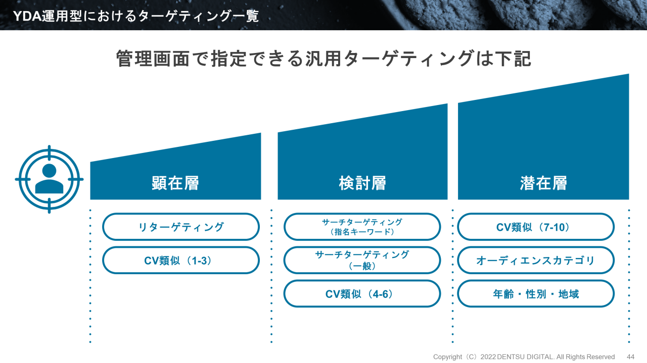 電通デジタル 櫻井康人(以下、櫻井) : Yahoo!ディスプレイ広告(YDA)には、自動化機能はありません。そこで、リターゲティングだけに頼った戦略から脱却するには、手動で配信をコントロールする以下のようなターゲティングメニューを利用します。