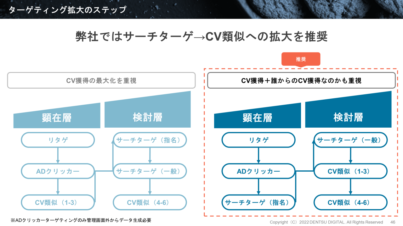 電通デジタルでは、単純にCV数を積み増していく「量を重視」より、「質も重視」を推奨します。「誰に対して広告を表示しているか」「誰からCVを獲得しているか」を分析することで、クリエイティブや訴求商材の見直しにもつなげられるためです。