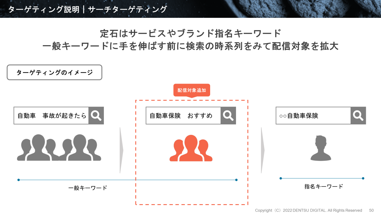しかし、「○○自動車保険」を指名検索するユーザーも、その前には「自動車事故が起きたら」「自動車保険 おすすめ」といった一般キーワードで検索しているはずです。ですから、最初は指名キーワードでサーチターゲティングを始め、続いて指名キーワードの1段階前の検索で使われる一般キーワードを追加していくような手順を検討、実施します。