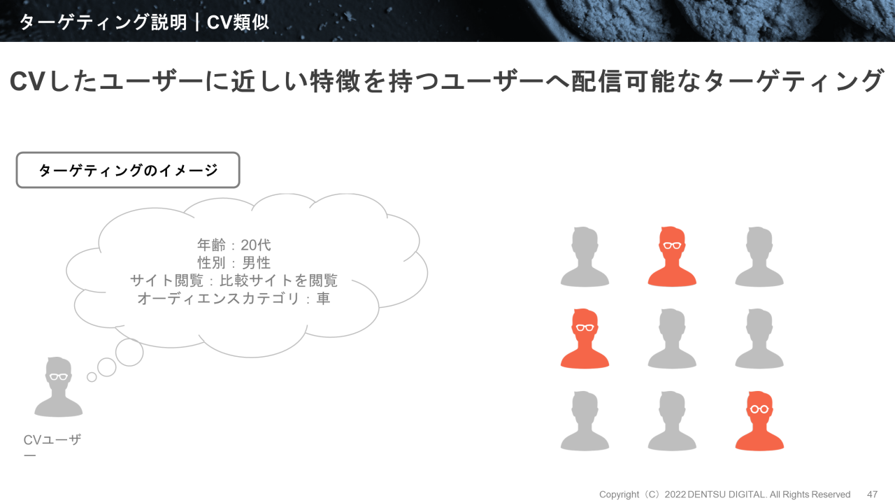 次に、CV類似です。CV類似は、CVしたユーザーに近しい特徴を持つユーザーへ配信するターゲティングです。