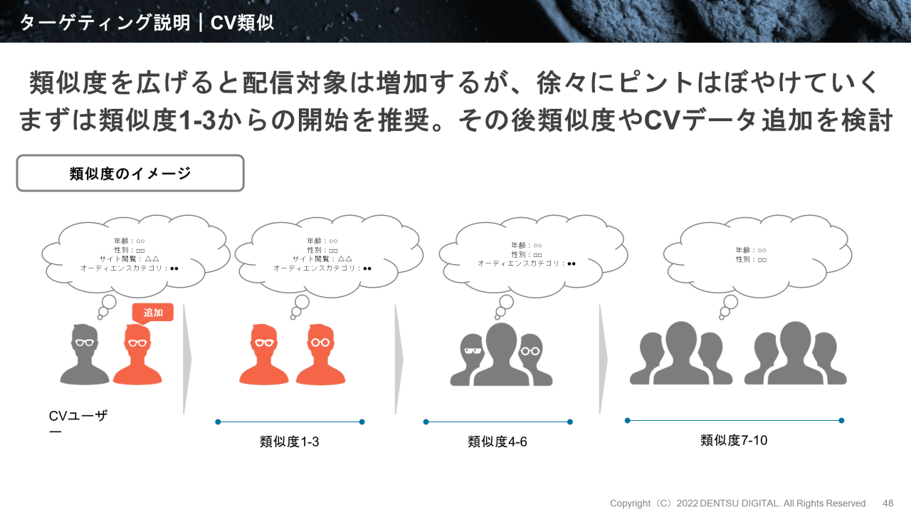 CV類似には類似度という概念があり、「1-3」「4-6」「7-10」の3区分を電通デジタルにおいてはしています。数字が大きくなるほど類似性が落ちるため、まず類似度「1-3」で、CVユーザーに近しいであろうターゲットに配信します。