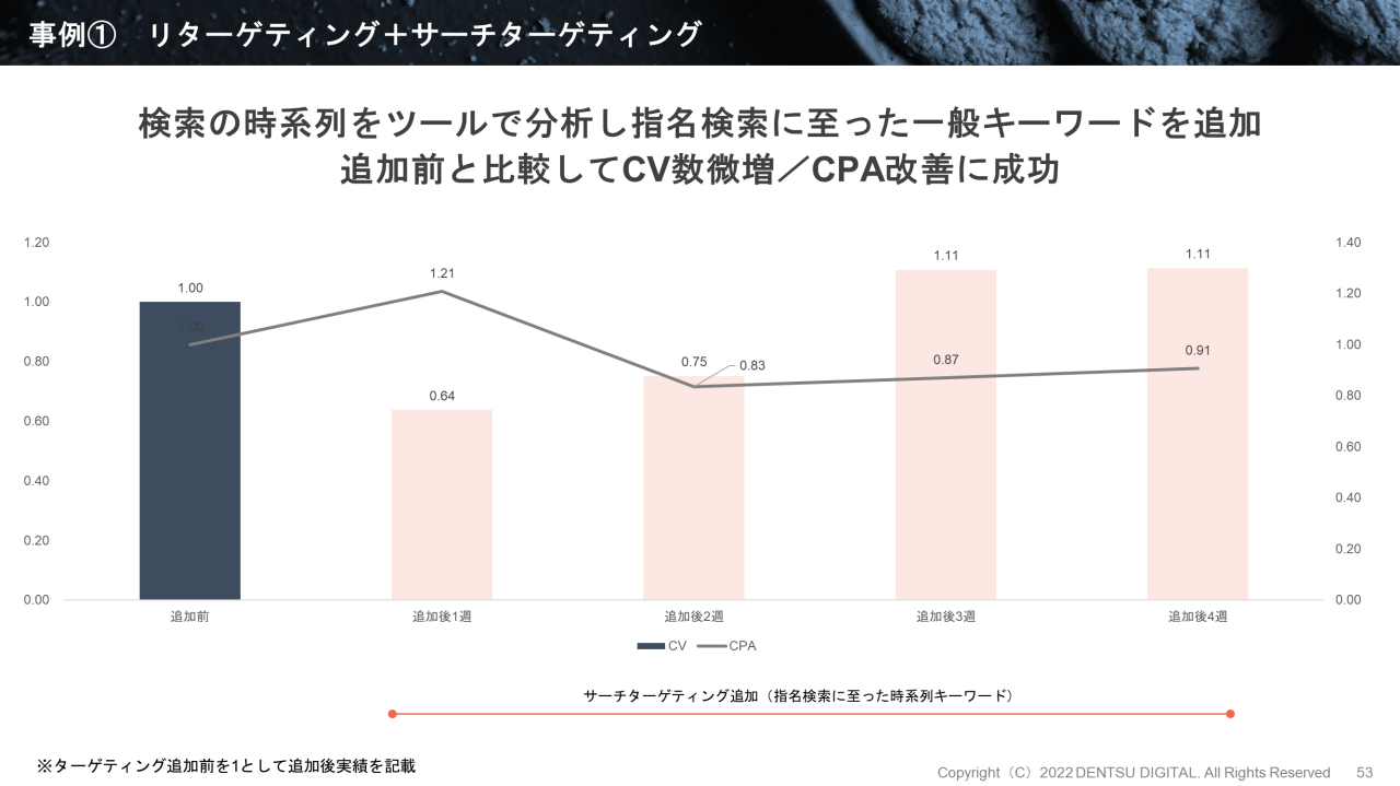 ここで2つの事例をご紹介します。事例1は、リターゲティングに加え、一般キーワードをサーチターゲティングに追加した事例です。