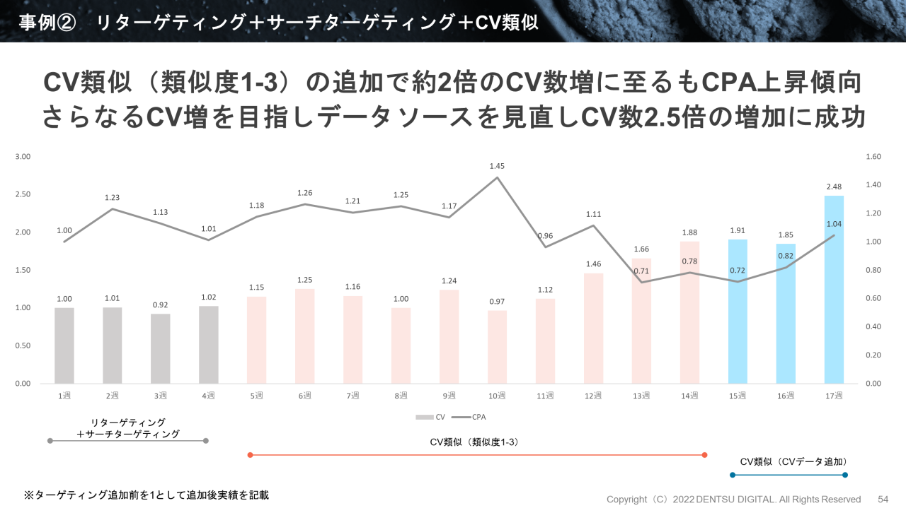 検討期間が長いタイプの商材であることを考慮し、15週目からはYahoo!検索広告のCVデータも加えて新たなCV類似に切り替えました。そこから経過観察し、自動入札の見直しや広告精査を行ったところ、CV数は第1週の2.48倍まで伸び、CPAも元の水準まで下げることに成功しました。
