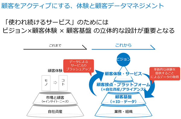 第2に、単純な顧客体験の向上にとどめず、ビジョン×顧客体験×顧客基盤という立体的な設計をしていくこと。「使われ続ける」「売れ続ける」サービスのプラットフォームを設計する。幅広く取れた顧客基盤を対象に接点を持ち、革新的な体験を提供することで顧客データを取得し、それを基にサービスを磨く。こうすることで使われ続ける関係性を構築する。