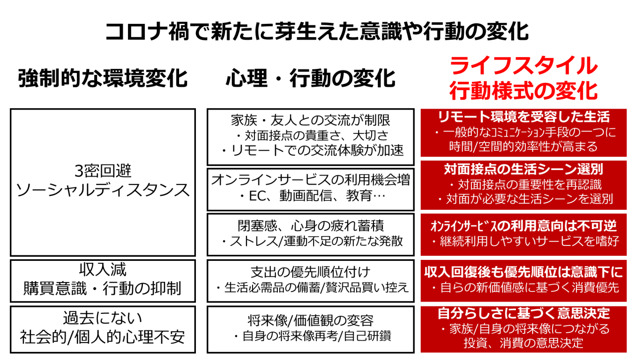 このコロナ禍で起きた行動の変化や、新たに芽生えた意識にはどういうものがあるのか、まとめてみたのが以下の図です。