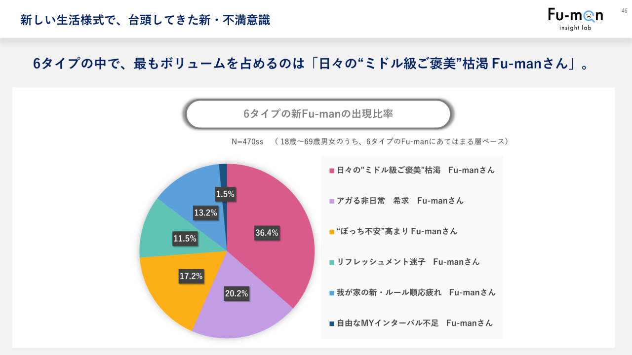 これら調査で浮かび上がってきた具体的な不満内容を踏まえて、これからの社会で予想される不満傾向を6タイプの"新Fu-manさん"としてカテゴライズしました。