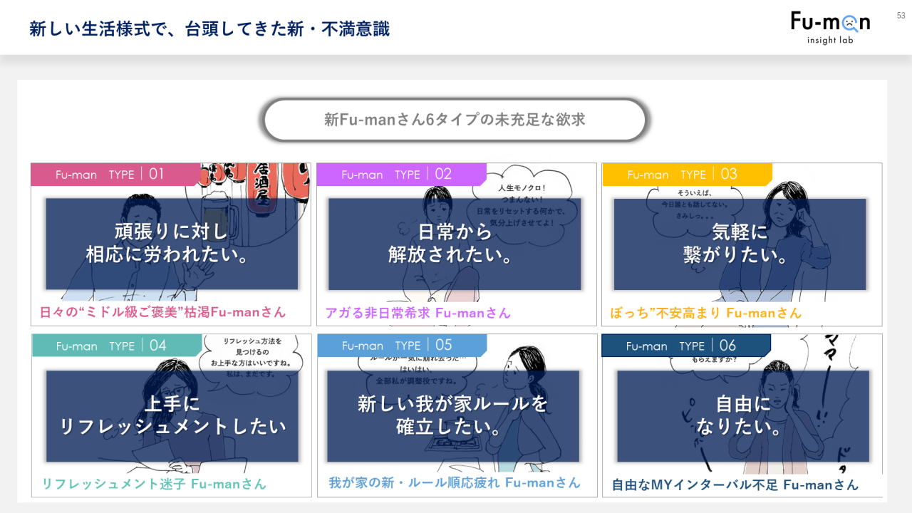 "人々(ヒューマン)の不満"に迫れば、新しい価値の種が見えてきます。Fu-man insight lab™では、ご紹介しました6タイプのFu-manさんの他、食生活周りの不満にもフィーチャーし、調査いたしました。今後は、さらにカテゴリーを拡げ、美容やレジャーに関する不満も探索・ストックし、生活者インサイトタンクとしての機能をより強化していく予定です。今後も日々変化をする社会において「不満を起点に生活者が何を感じ、求めているか」を敏感に捉えた情報を発信し、企業の皆さまの新しいCX変革の支援・サポートしてまいります。