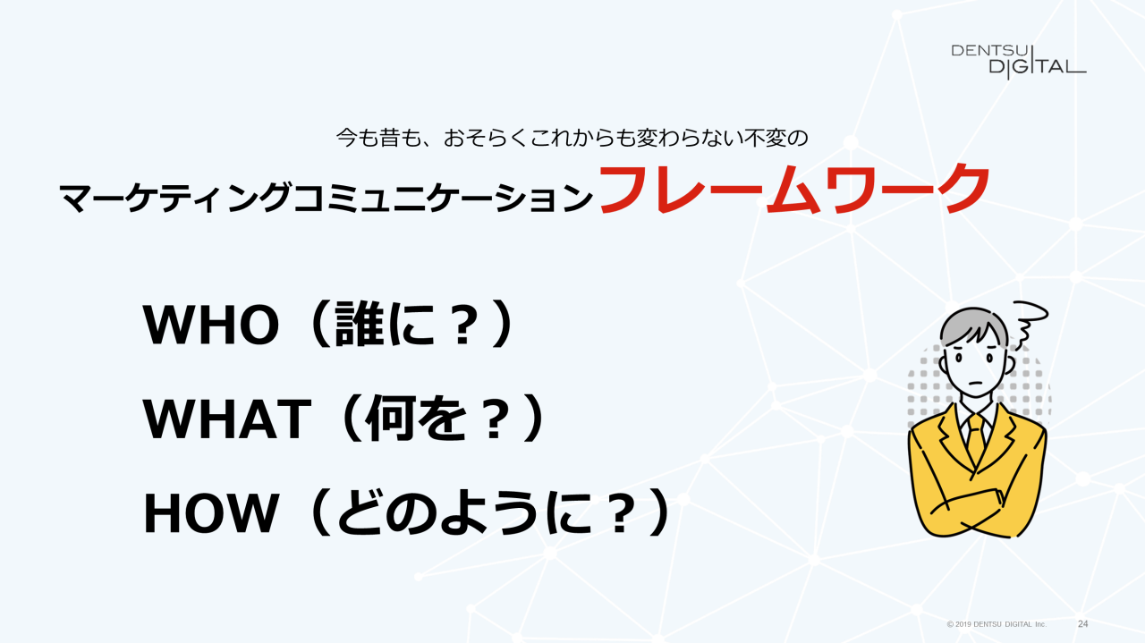 フレームワークの構成要素は、「WHO(誰に)」「WHAT(何を)」「HOW(どのように)」の3つ。本記事では「WHO(誰に)」と「WHAT(何を)」の2つに絞って説明します。