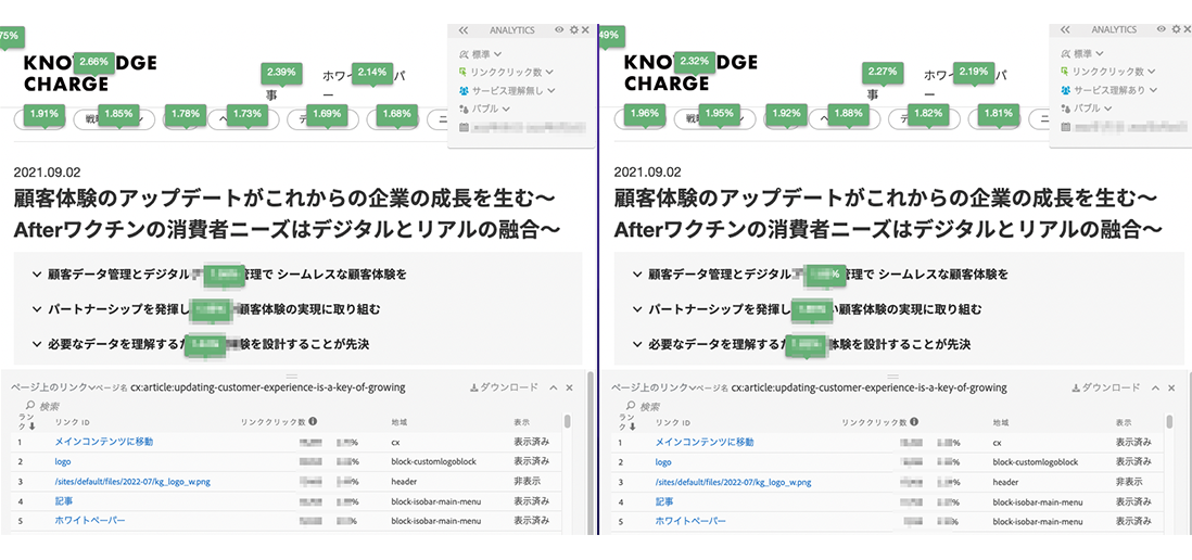 Adobe Analytics上で作成したセグメントも適用でき、「サービス理解のコンテンツを閲覧」有無の比較などが可能。例の場合、サービス理解コンテンツを閲覧している人たち(上図右)は、閲覧していない人たち(上図左)に比べて、グローバルナビゲーションのタグを使って他のコンテンツにも回遊している傾向が見える(数値はサンプルです)