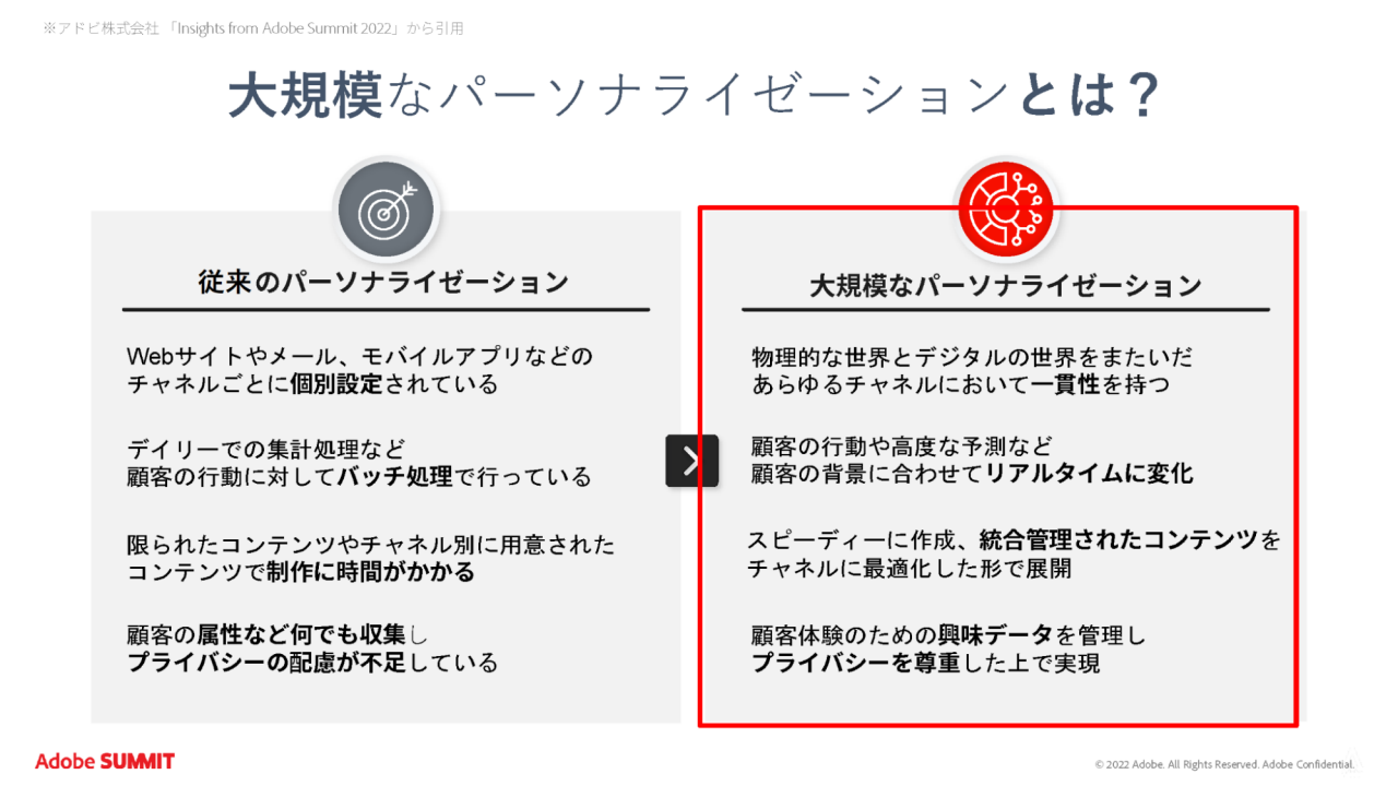 従来のパーソナライゼーションは、スケーラビリティ(拡張性、規模拡大性)を発揮できない問題を抱えています。具体的には、チャネルごとに個別設定されている、集計作業などをバッチ処理で行っている、コンテンツの制作・提供に時間がかかる、プライバシーへの配慮が不足している、などです。