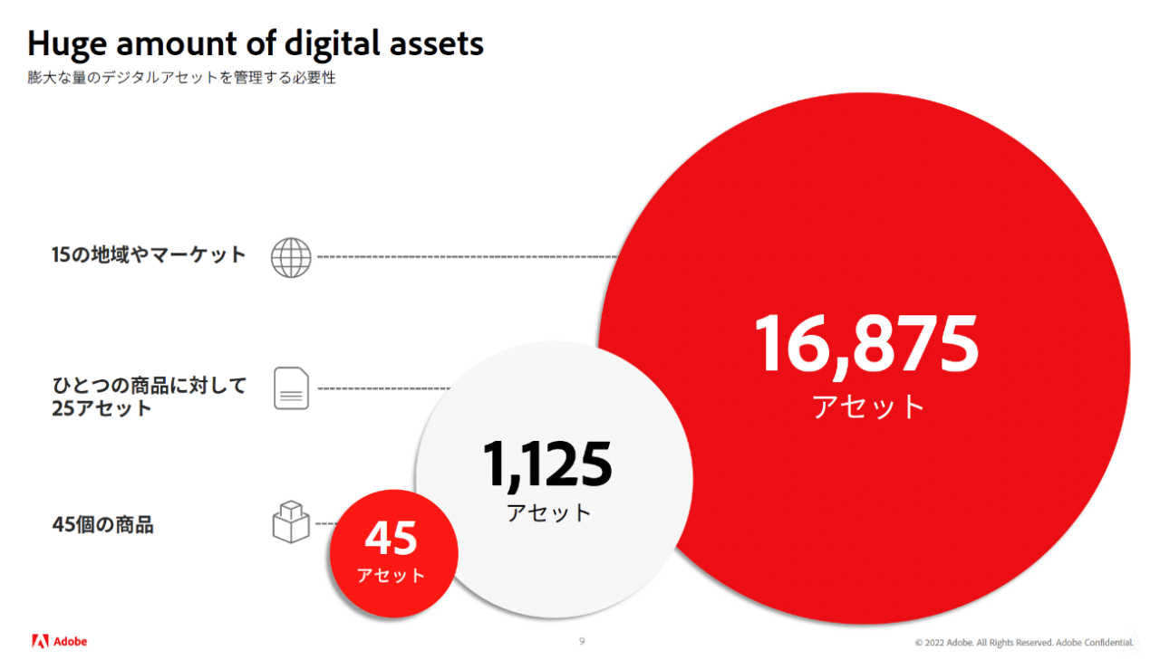 具体的な例で説明します。1つの商品に対するデジタルアセット(ここでは画像のみ)は、一般的に25程度とされます。仮に45個の商品を15の地域やマーケットへ配信すると、16,875のデジタルアセットを管理しなくてはなりません。