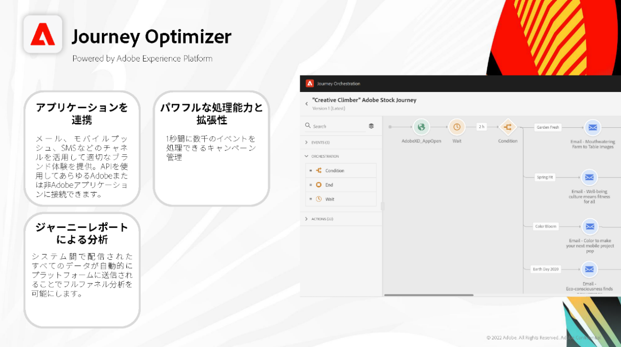 顧客体験を創出するソリューションであるAdobe Journey Optimizerでは、オムニチャネルでのメッセージ配信やオファーコンテンツの表示をデザインできます。