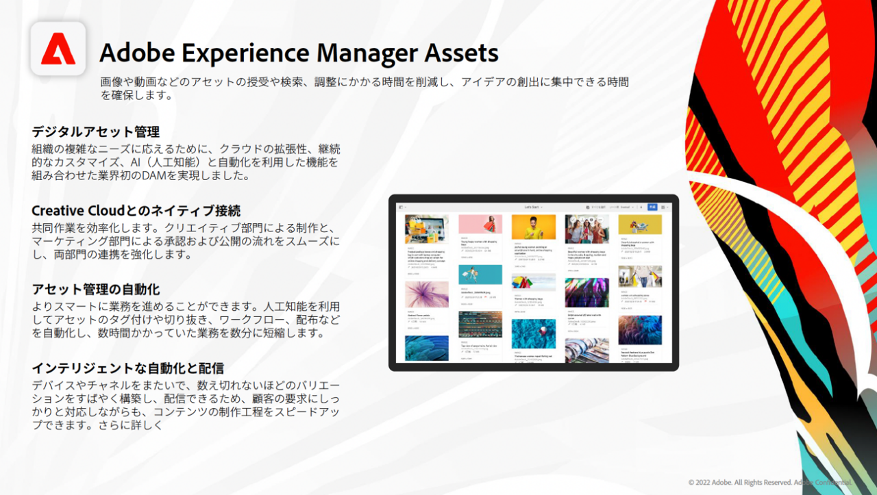 一方、膨大なデジタルアセット管理には、Adobe Experience Manager Assetsを使います。