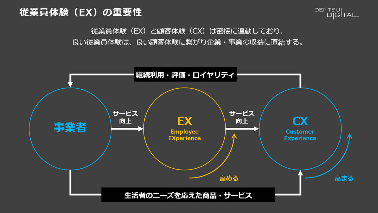 生存条件の2つ目は、従業員体験(EX)を最大限に高めることだ。「顧客体験(CX)がスポットライトを浴びがちですが、実は事業者が顧客に物を売る場合、その間に必ず従業員・店員が存在します。その従業員がいい体験をできないままでは、顧客にいい体験をもたらすことはできません。従業員のエンゲージメントが高いと、それに連動して顧客満足度も上がることはさまざまな調査で明らかになっています」