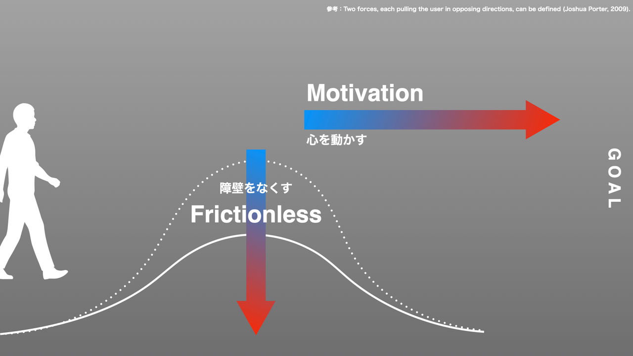 モチベーションは生活者の心を動かし、ゴールに向かわせる矢印。フリクションレスはゴールに向かう道筋にある障壁を最小限に押し下げる矢印です。ここでのゴールはさまざまありますが、ありていにいえば、生活者が「製品やサービスを好きになる」「購入する」「会員になる」などの”行動”がそれにあたります。