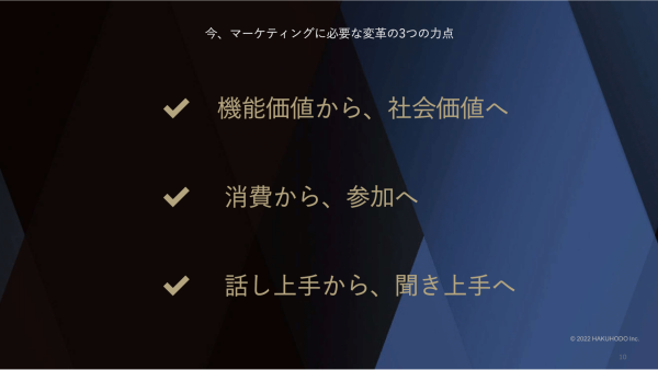 1つ目は、「機能価値から、社会価値へ」です。社会全体や生活がデジタル化によって大きく急変し、目的、意義、パーパスが問われる時代になっています。「その商品やサービスは本当に必要なのか、社会にとってどのような価値があるのか、マーケティングのウェイトも、機能価値の差異化から社会価値へ変化しなくてはなりません」と、宮澤氏は社会の変化をただ黙って見ているのではなく、企業自身もその変化に合わせて自社の存在意義を見つめ直し、意識変革することが重要だと強調します。