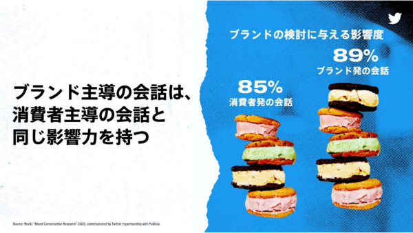 2つ目は「会話を始めてみる」です。「Twitterは、個人とブランドが一利用者としてフラットに参加できるのがおもしろいところ」という橋本氏は、ここでTwitterがPublicisと共同で実施した調査[2]を紹介。「ブランド主導の会話は、消費者主導の会話と同じ影響力を持つという結果が出ています。言及や反応を待つだけではなくて、ブランドがみずから会話を始めてみることも大事ではないでしょうか」と考察を加えました。