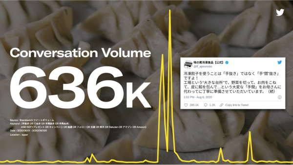 2020年夏、「冷凍餃子を食卓に出すのは手抜きだ」というツイート[4]に対し、味の素冷凍食品公式アカウントが、「冷凍餃子を使うことは『手抜き』ではなく『手“間”抜き』ですよ!」[5]と発信したところ、多くの反響があり、「冷凍食品は手抜き? 手間抜き?」論争が始まりました。