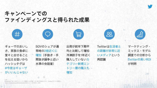 この盛り上がりを受け、味の素冷凍食品はテレビCMの放映を2021年4月16日にスタート。CMの認知と話題の最大化を狙い、放映前と放映後にTwitterを活用しました。橋本氏は、このキャンペーン事例の取り組みですばらしかったポイントを5つにまとめました。