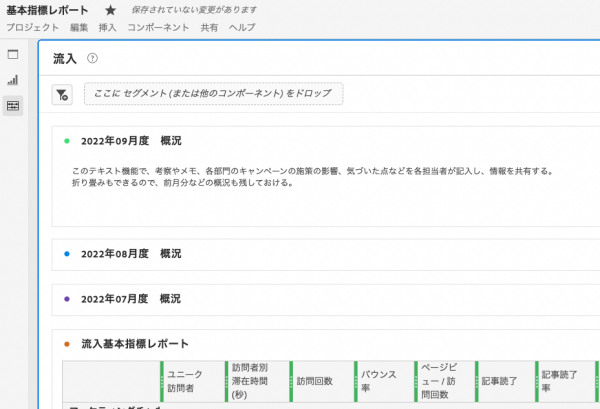 「テキスト」を使えば、レポートを更新し、分析を進める中で気づいたことや気になったこと、変化の兆しなどを直接メモとして書き記せます。その上で社内のステークホルダーに共有すれば、集計分析データを用意する意味や意義が明確になります。前段でも書いたように、データから読み取れる顧客行動の変化や心理変容を見つけ出していくことがレポート作成の目的です。分析作業を通じて得られた気づきは、自部門メンバーだけでなく、積極的に社内で共有していきましょう。