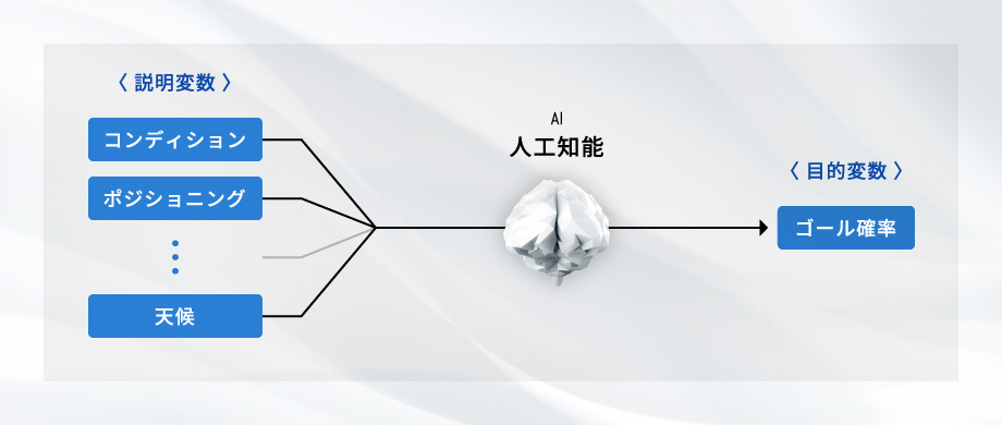 AI のモデルでは、目的変数と説明変数という二つの変数が設定されます。目的変数とは「求めたい結果」のことで、それを最適化するために説明変数(原因となる数字)を調整していくというのが AI モデルの実態です。この概念をサッカーを例に考えてみましょう。今回はサッカーにおける「ゴール」を目的変数(結果)として考えます。