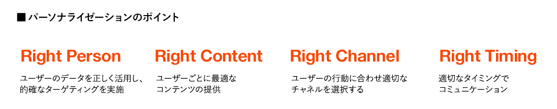 これらを最適な状況にした上で、CXにドライブをかけるなら、重要なのは「パーソナライゼーション」だと考えられます。顧客を個客と捉えるために検討が必要な点は「4つのR」で示すことができます。