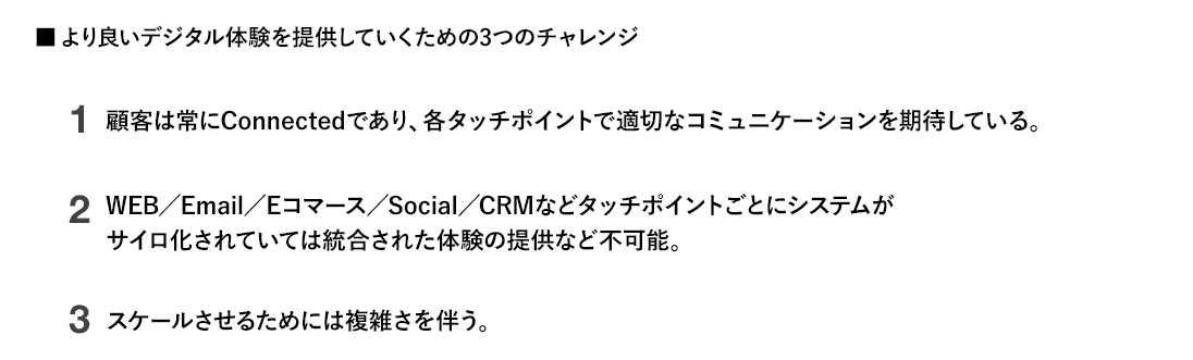 つまり、同じ方向を向いて同じ価値を求めていたマスの時代から、ユーザーを一人ひとり把握してコミュニケーションしていくことが求められる時代になり、ものの価値だけではなく、そこにいかに付加価値としての体験を提供できるかが重要になった」。