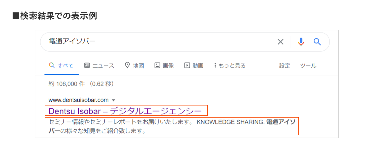 Meta description要素:ページの内容を表した文章です。直接的に順位上昇をさせる効果は認められませんが、検索結果に表示されるため、ユーザーがクリックしたくなるような内容としましょう。