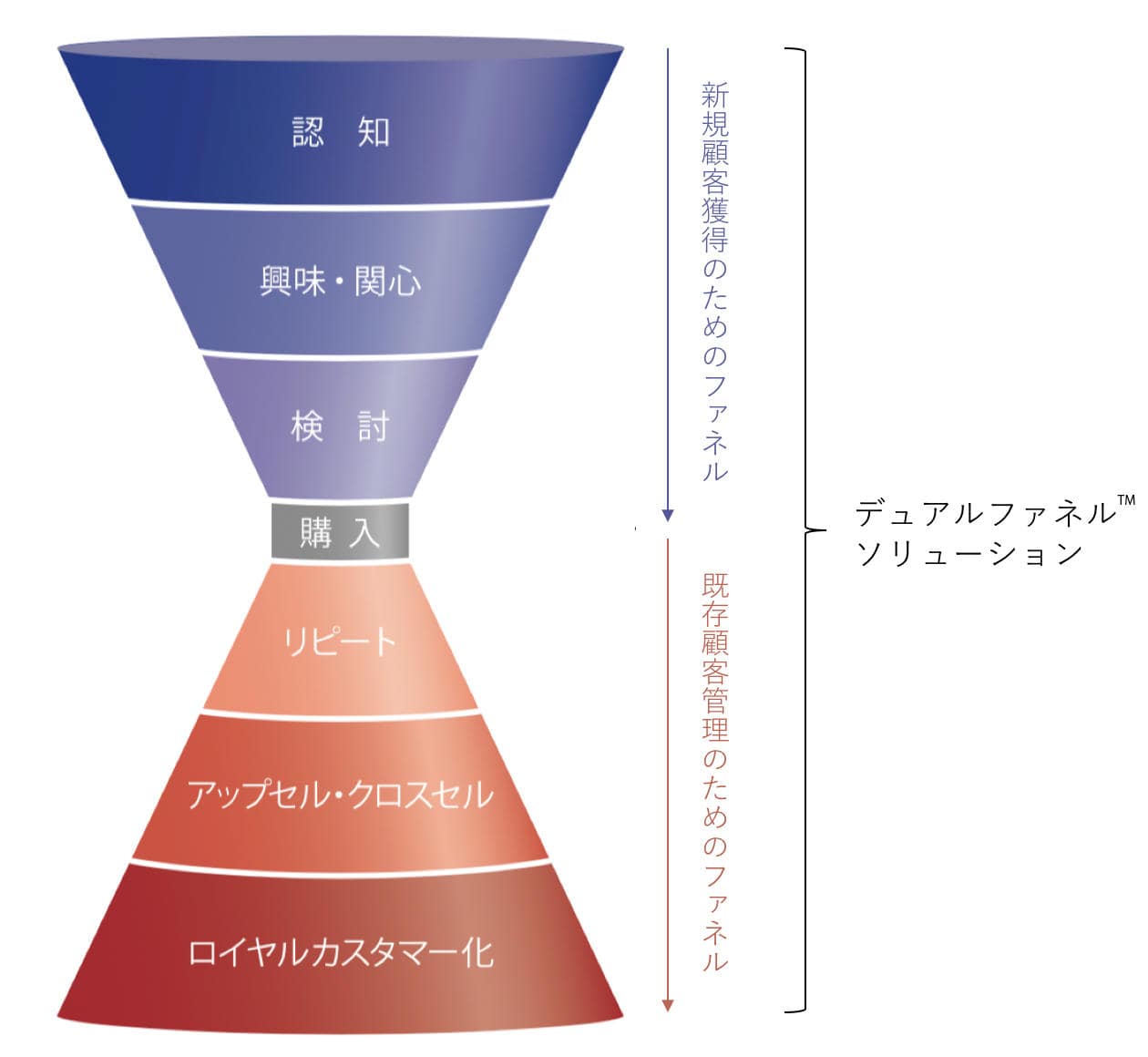 ※ デュアルファネル™のマーケティングとは、顧客一人ひとりに寄り添い、適切なコミュニケーションを行うため、認知から好意、興味・関心、意向、購買、その先の再購入、そしてロイヤルティーの育成・向上までの網羅するアプローチのこと(下図参照)。