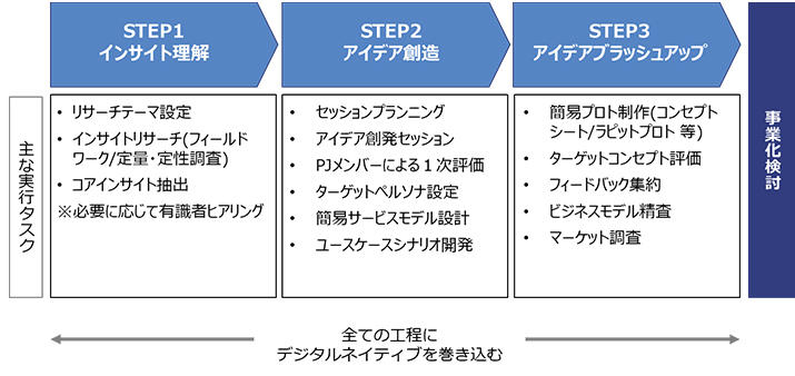 「YNGpot.™」のオーソドックスなサービス開発は、「インサイト理解」「アイデア創造」「アイデアブラッシュアップ」の3ステップがあります。プロジェクトのサイズにもよりますが、だいたい2ヶ月半〜3ヶ月ほどで回しています。このステップで重要なポイントをご紹介します。