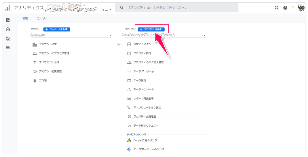 まず、Googleアナリティクスの[管理]画面を開き、[プロパティを作成]をクリックします。