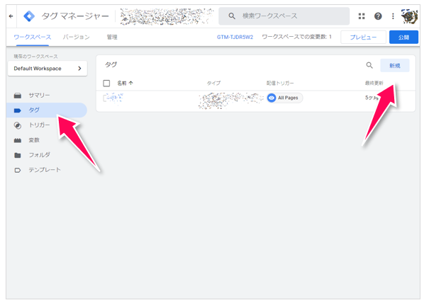 該当するコンテナで左メニューから[タグ]をクリックして、次に[新規]をクリックします(どのコンテナを利用するかに関しては、管理者に必ず確認するようにしましょう)。