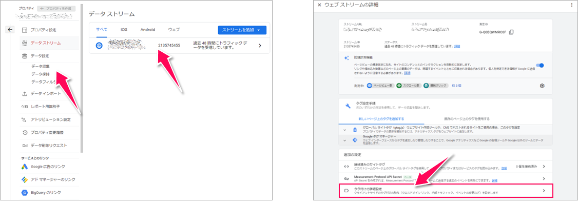 まずは、[管理]>[プロパティ設定]>[データストリーム]を開き、対象のデータストリームをクリックします(下図左)。[ウェブストリームの詳細]という画面が表示されるので、最下部までスクロールして、[タグ付けの詳細設定]をクリックします(下図右)。