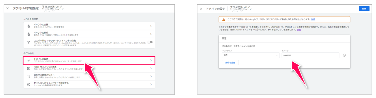 次に[ドメインの設定]をクリックします(下図左)。[マッチタイプ]と[ドメイン]を入力して保存します(下図右)。