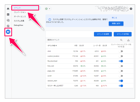 GA4では、イベント登録をしないと、コンバージョン設定ができませんので、イベント設定したあとに、コンバージョン設定を行います。今回は、コンバージョンとして設定することが多い「サンクスページの到達」を設定しておきましょう(今回は「サンクスページ到達」=「セミナー申し込み完了」としています)。