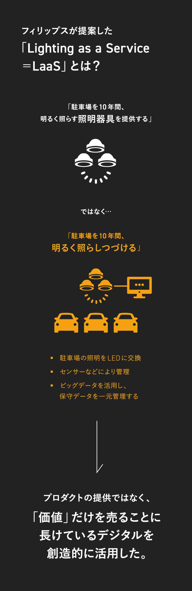 つまり、プロダクトそのものを売るのではなく、サービスとしての照明「Lighting as a Service=LaaS」を提案したことで、10年の長期契約を勝ち取ったんです。