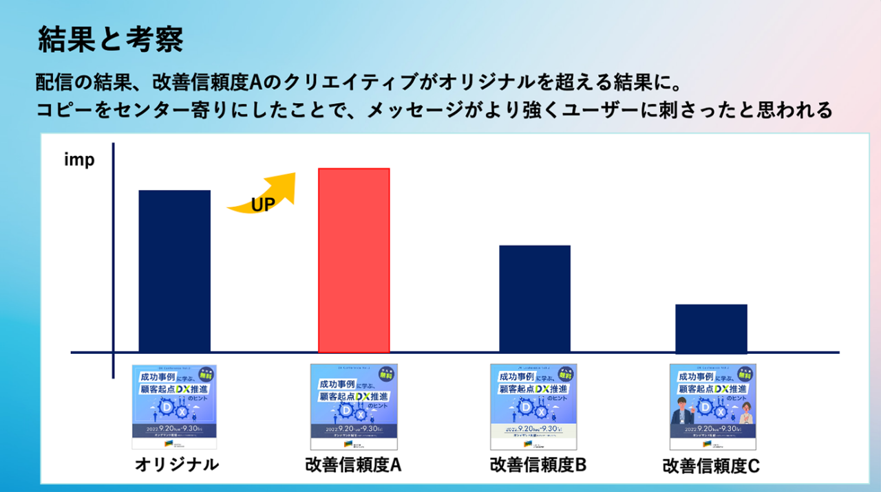 和田 : このようにオリジナルバナーを改善AIにかけることで、効果の高いクリエイティブのサジェストを行ってくれます。「コピーの位置を下にする」「背景の彩度を上げる」といったところまでAIが見てくれるのです。