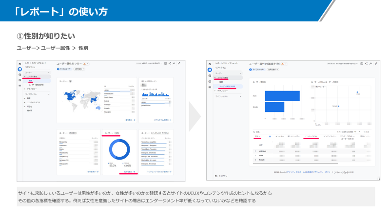 矢印のところに注目してください。「性別を表示」をクリックすると、「詳細」レポートに遷移できます。「詳細」レポートでは、表形式でディメンションと指標のデータを確認できます。